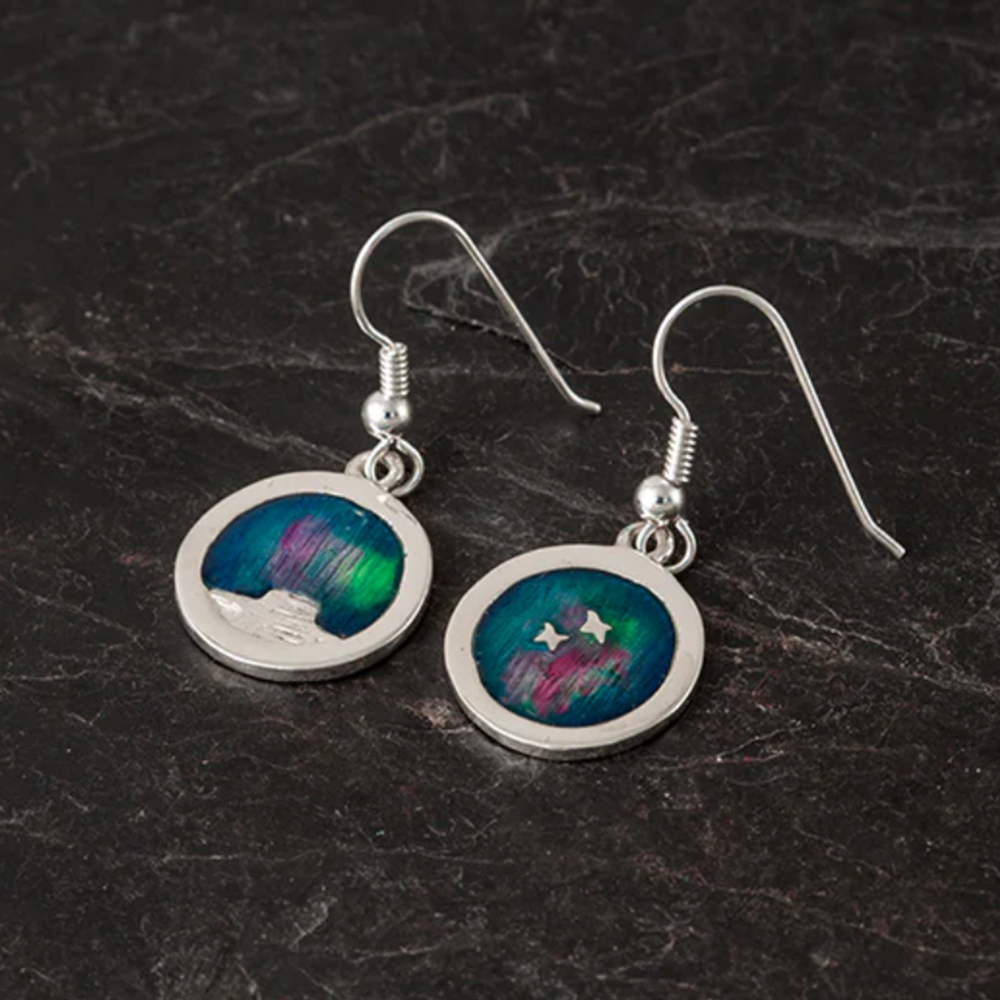 Stunning Northern Lights inspired silver broch hanging earrings by Shetland Jewellery. This design displays the beauty of Mousa Brooch at night with the aurora. ‘Mirrie Dancers’ is Shetland Dialect for ‘Northern Lights.’